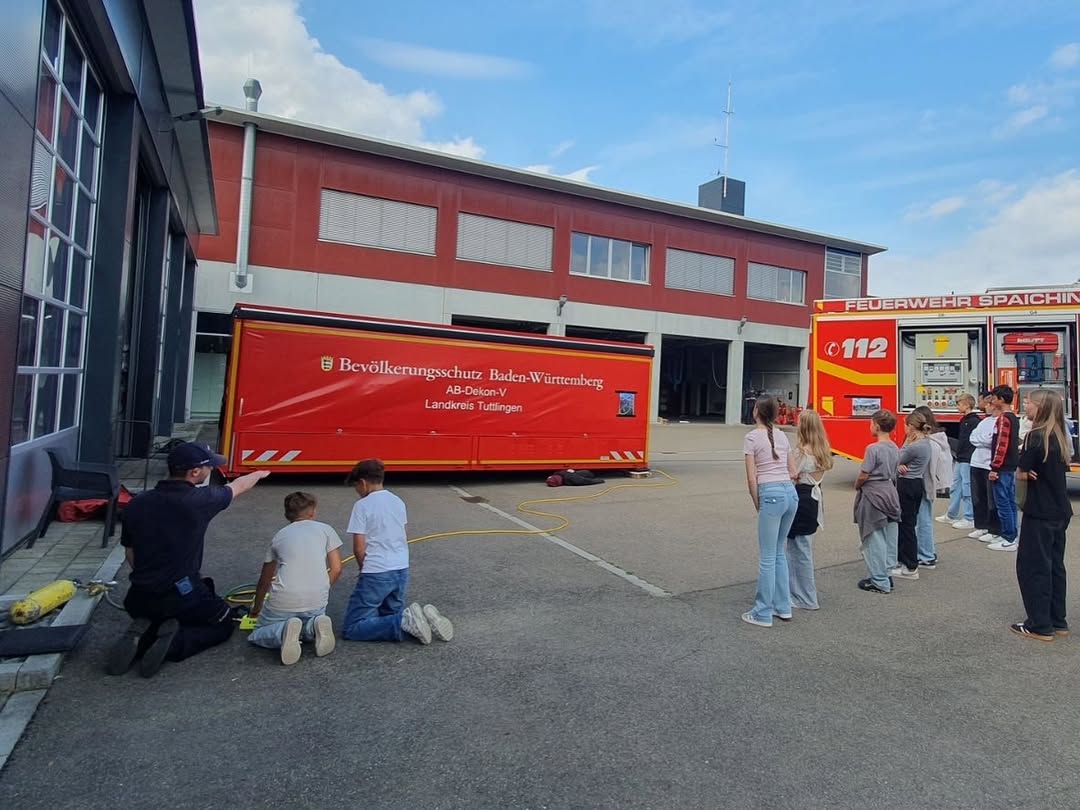 Am Dienstag, dem 15. Juli 2025, organisierte das Gymnasium Spaichingen in Kooperation mit der Feuerwehr Spaichingen einen Aktionstag zum Thema Katastrophenschutz für die Schüler der Klassen 6 des Gymnasiums. Die Schülerinnen und Schüler hatten bereits im Unterricht erarbeitet, was eine Katastrophe ist und welche unterschiedlichen Szenarien auftreten können. In diesem Kontext bekamen sie nun die Möglichkeit, in praktischen Übungen wichtige Informationen zum Katastrophenschutz zu erhalten und wichtige Handlungsweisen zu erlernen. Die Veranstaltung umfasste drei Stationen, die in insgesamt 90 Minuten durchlaufen wurden. Unter der Anleitung von erfahrenen Einsatzkräften der Feuerwehr erarbeiteten sich die Kinder an den verschiedenen Stationen fundiertes Wissen.