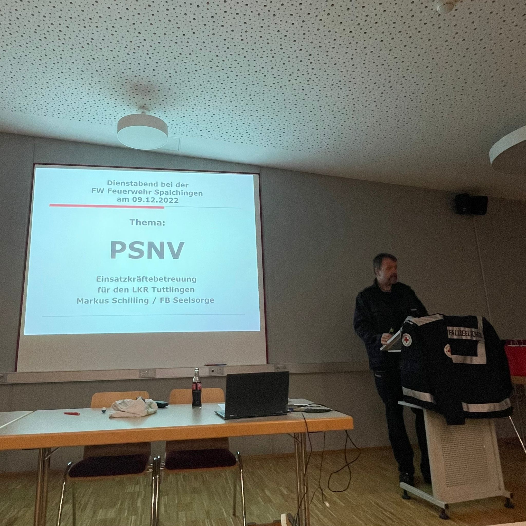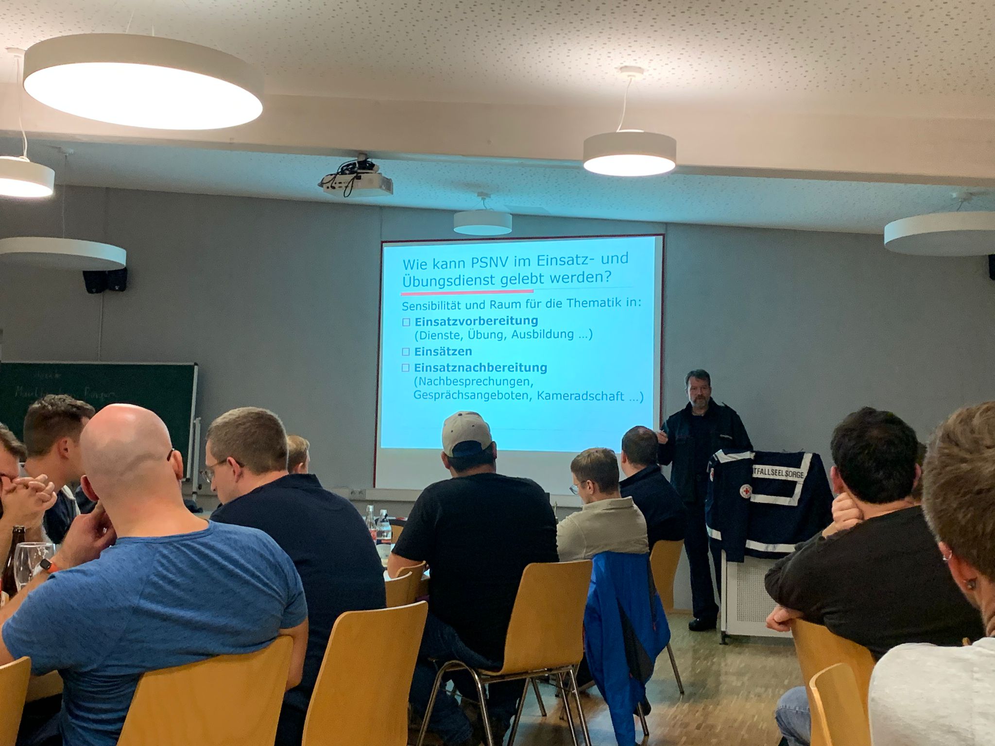 Im Detail stellte Markus Schilling in seinem anschaulichen Vortrag die Organisation und Möglichkeiten der PSNV im Landkreis Tuttlingen vor. Der Fokus lag hierbei auf den Angeboten, die für Einsatzkräfte wie z.B. Feuerwehrleute bestehen. Zum Einen sind dies präventive Maßnahmen, zum Zweiten die Nachsorge nach psychisch oder physisch belastenden Einsätzen bei denen die ehrenamtlichen Kräfte eingesetzt wurden.