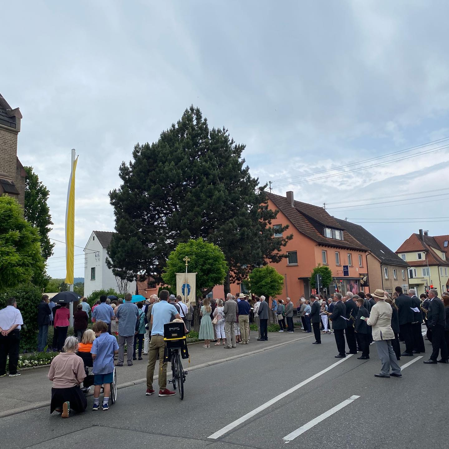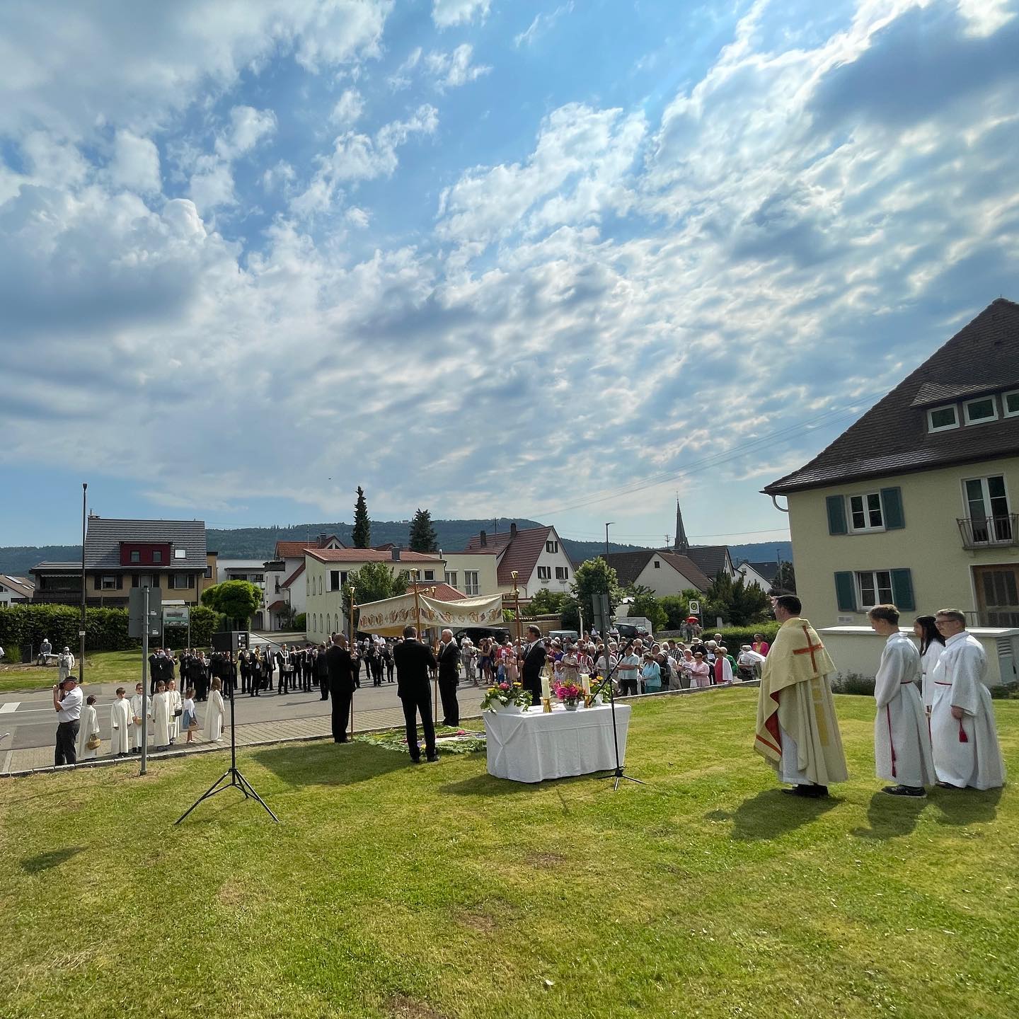 Am Morgen des Fronleichnam Feiertags absolvierte die katholische Kirchengemeinde die traditionelle Fronleichnamsprozession angeführt von Pfarrer Sebastian Tanneberger. Die Prozession führt hierbei alljährlich von der Stadtpfarrkirche zum ersten Altar mit Blumenteppich am Friedhof und von dort weiter zum Altar mit Blumenteppich an der Marienkapelle. Weiter geht es im Anschluss zum Altar mit Blumenteppich am Altenzentrum St. Josef in der Alleenstraße und schließlich zum Abschluss in den Stadtteil Hofen zur dortigen St. Josefs Kirche, wo der letzte Altar mit Blumenteppich kreiert wurde. Die musikalische Umrahmung stellte die Stadtkapelle Spaichingen.
