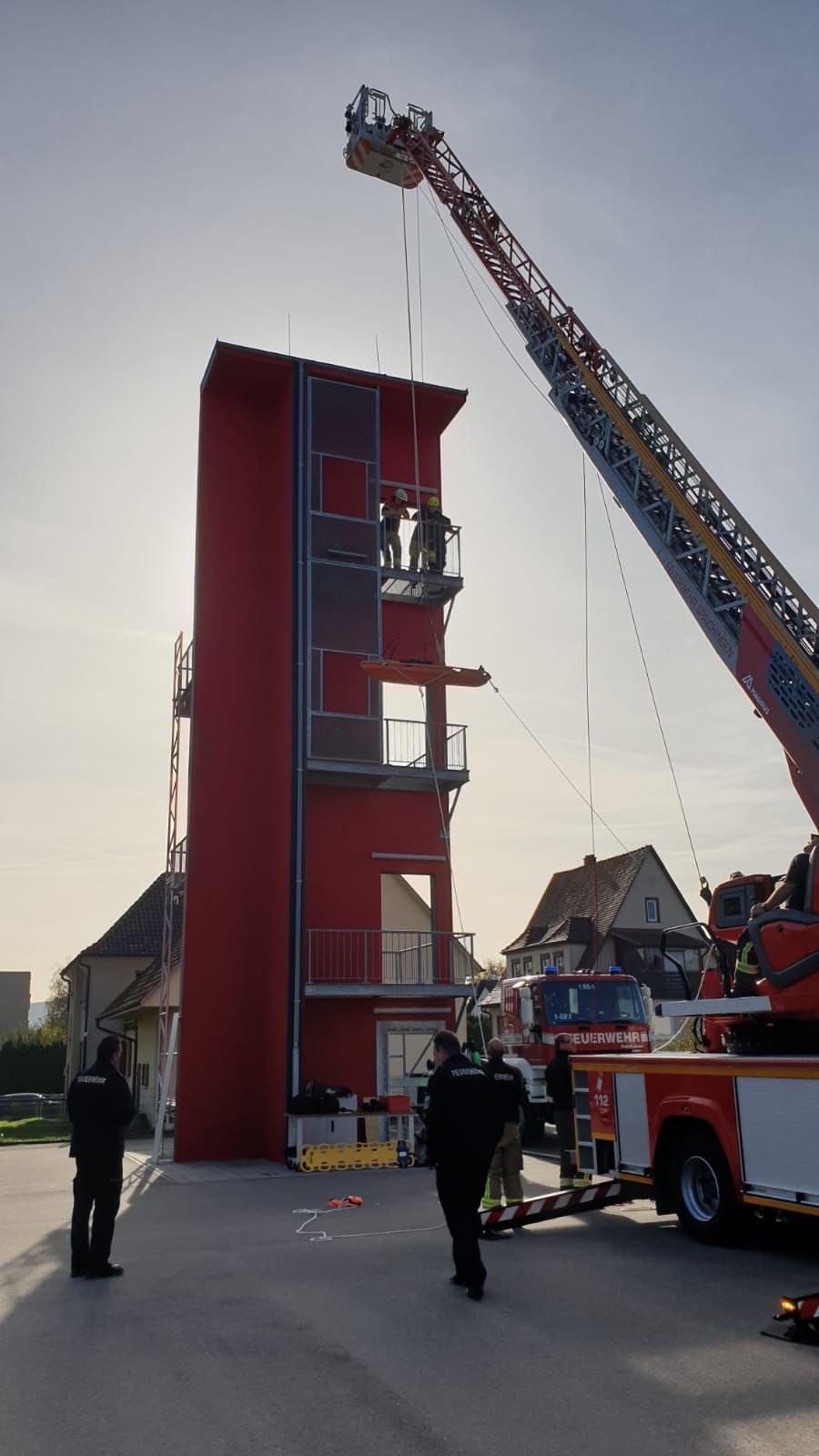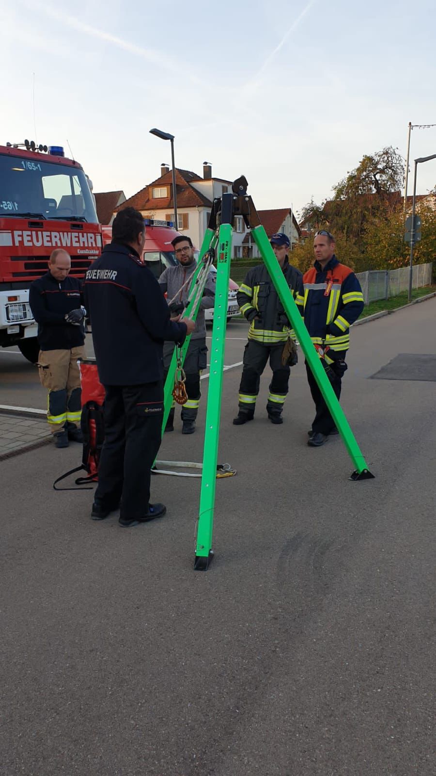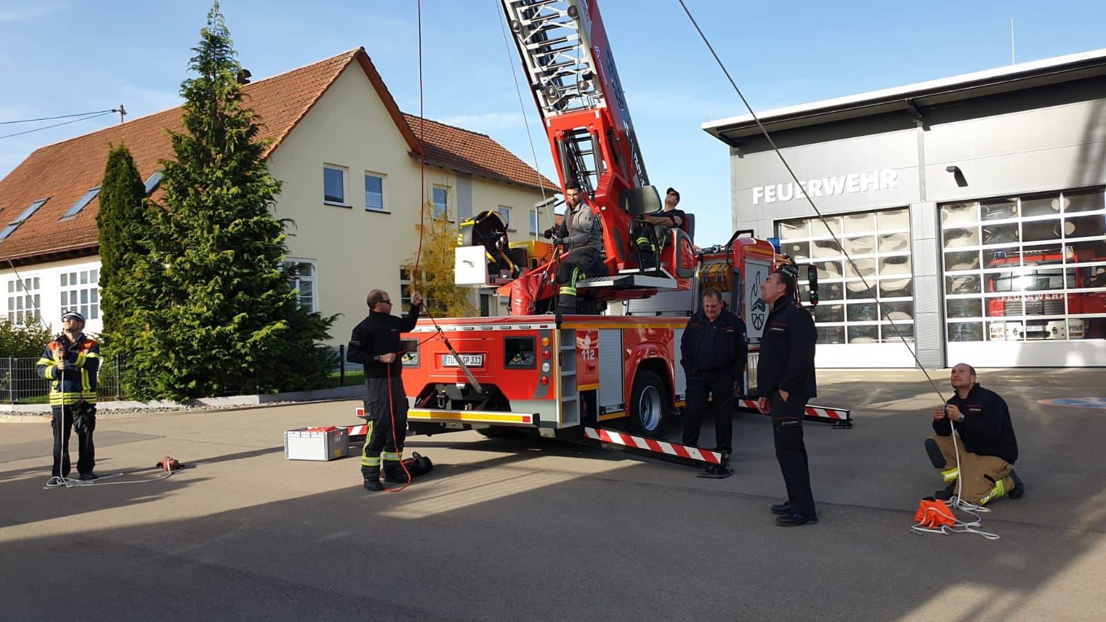 Am vergangenen Wochenende kamen bei der Feuerwehr Aldingen die Kreisausbilder Absturzsicherung des Landkreises Tuttlingen zusammen. Die ehrenamtlichen Feuerwehrangehörigen aus unterschiedlichen Kreisgemeinden trafen sich, um Details eines Lehrgangs zur sogenannten Einfachen Rettung aus Höhen und Tiefen (ERHT) auszuarbeiten. Die geplante Ausbildung baut auf dem bereits etablierten Kreislehrgang Absturzsicherung auf und soll Feuerwehrangehörigen während zwölf Unterrichtseinheiten beispielsweise den Umgang mit speziellem Höhensicherungsgerät vermitteln. Ein anderer Aspekt ist die Einbindung der Drehleitern der Feuerwehren bei der ERHT. Hierzu waren auch die beiden Kreisausbilder Absturzsicherung der Feuerwehr Spaichingen mitsamt der Drehleiter in Aldingen vor Ort.