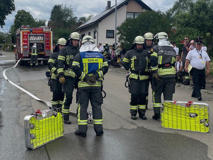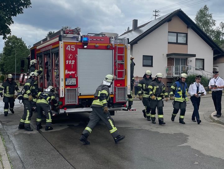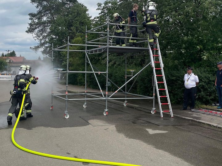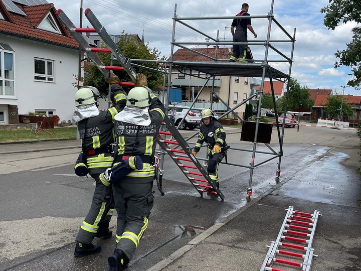Dreizehn Spaichinger Wehrmänner traten dieses Mal aufgeteilt auf zwei Gruppen in der Stufe Bronze an, die meisten zum ersten Mal. Bestandteil des Leistungsabzeichens Bronze ist eine praktische Übung Löschangriff im Außenangriff samt Personenrettung.