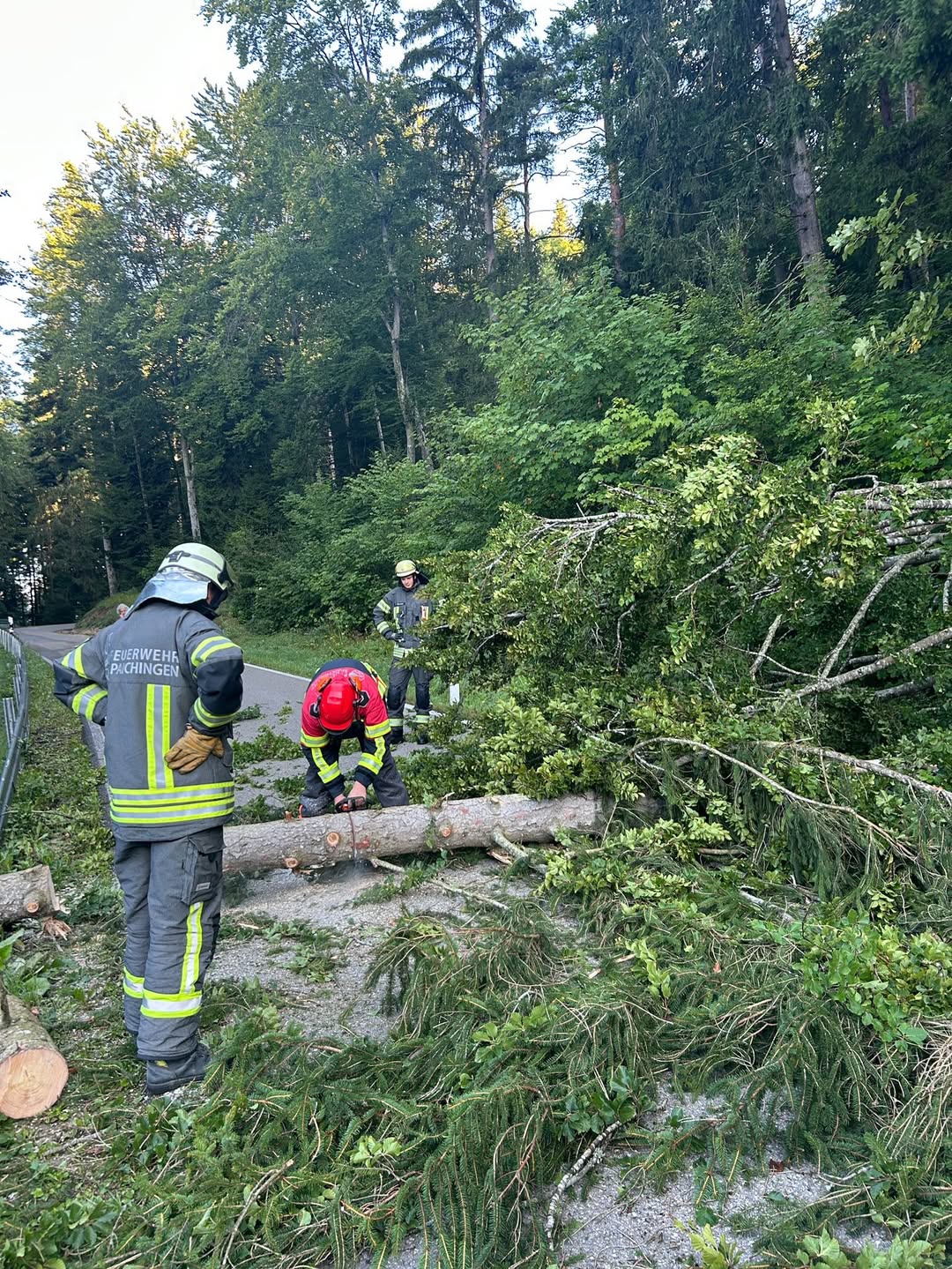 Mithilfe einer Kettensäge wurde das Hindernis beseitigt und nach ca. einer Stunde konnte die Straße wieder freigegeben werden.
