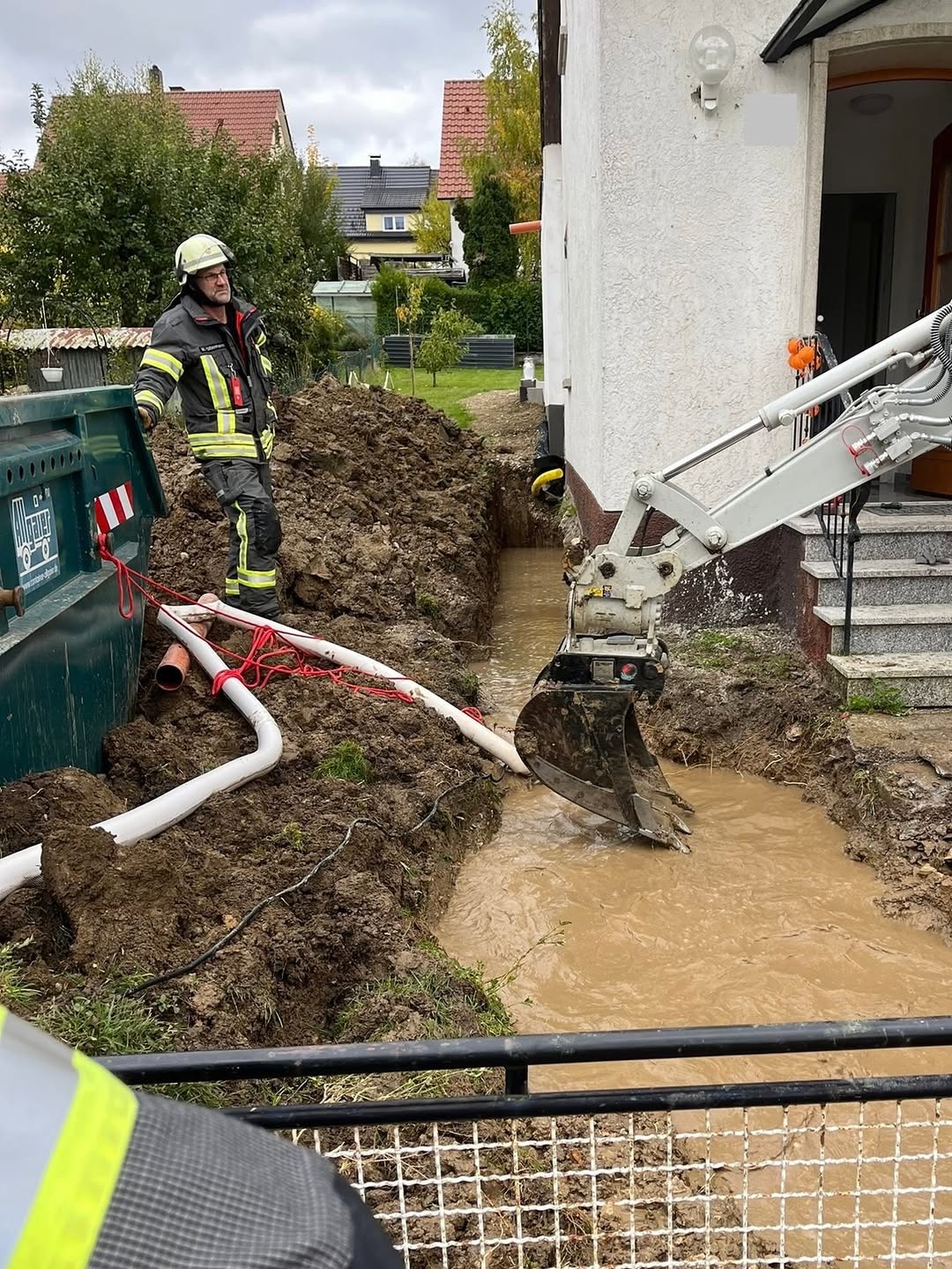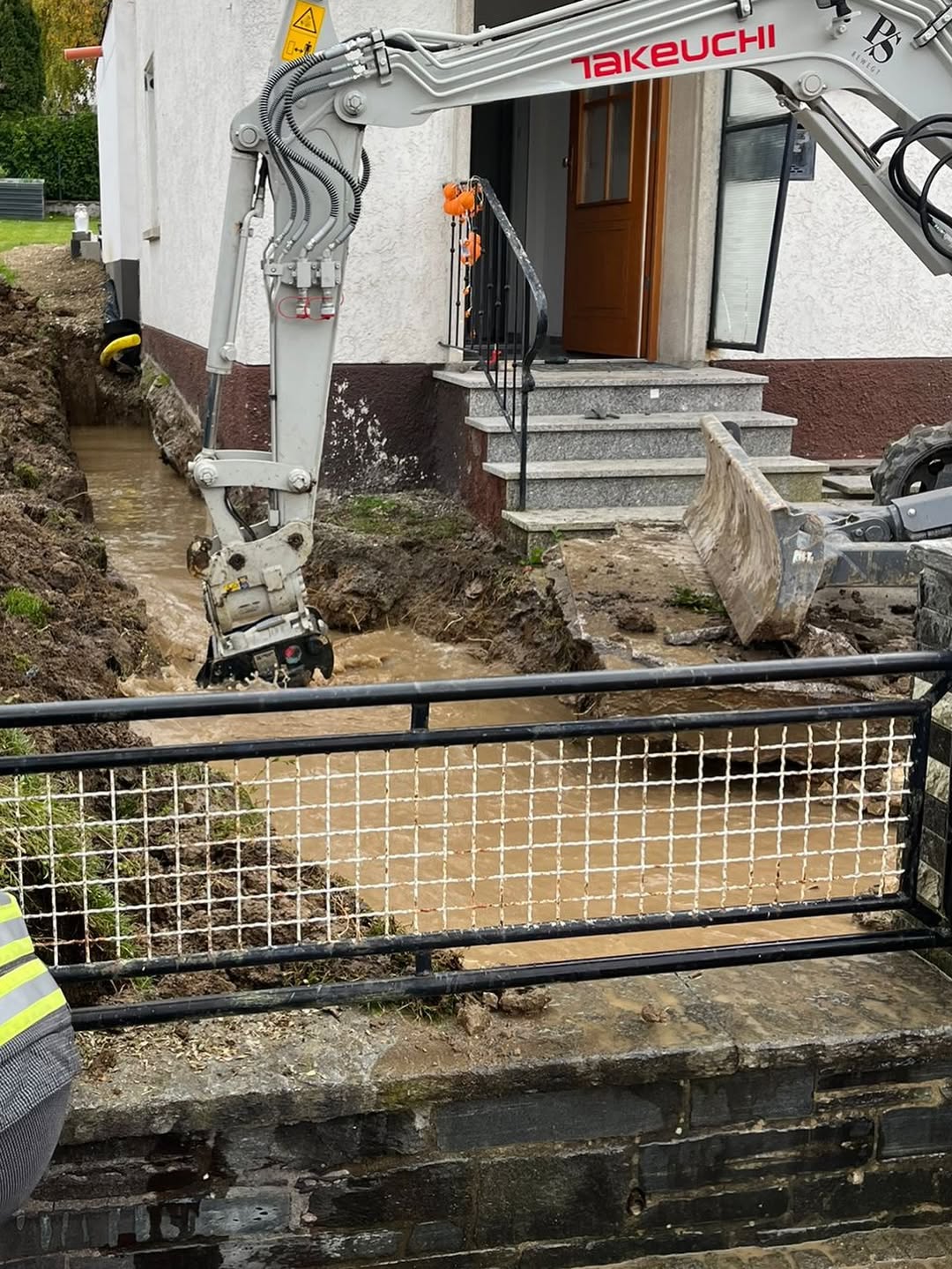Bei Erdarbeiten mit einem Bagger war die Hauptwasserleitung des Gebäudes beschädigt worden. Infolge der Beschädigung trat massiv Wasser aus und überflutete innerhalb kürzester Zeit die komplette Grube. Das Wasser stand zwischenzeitlich bis zu zwei Meter tief. Hierdurch drohte das Wasser in den Keller des Wohngebäudes einzutreten.